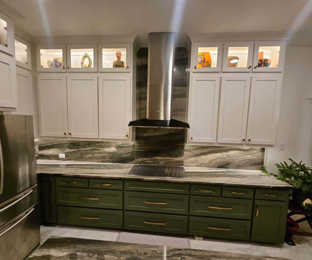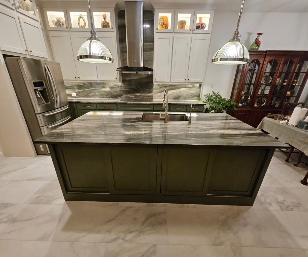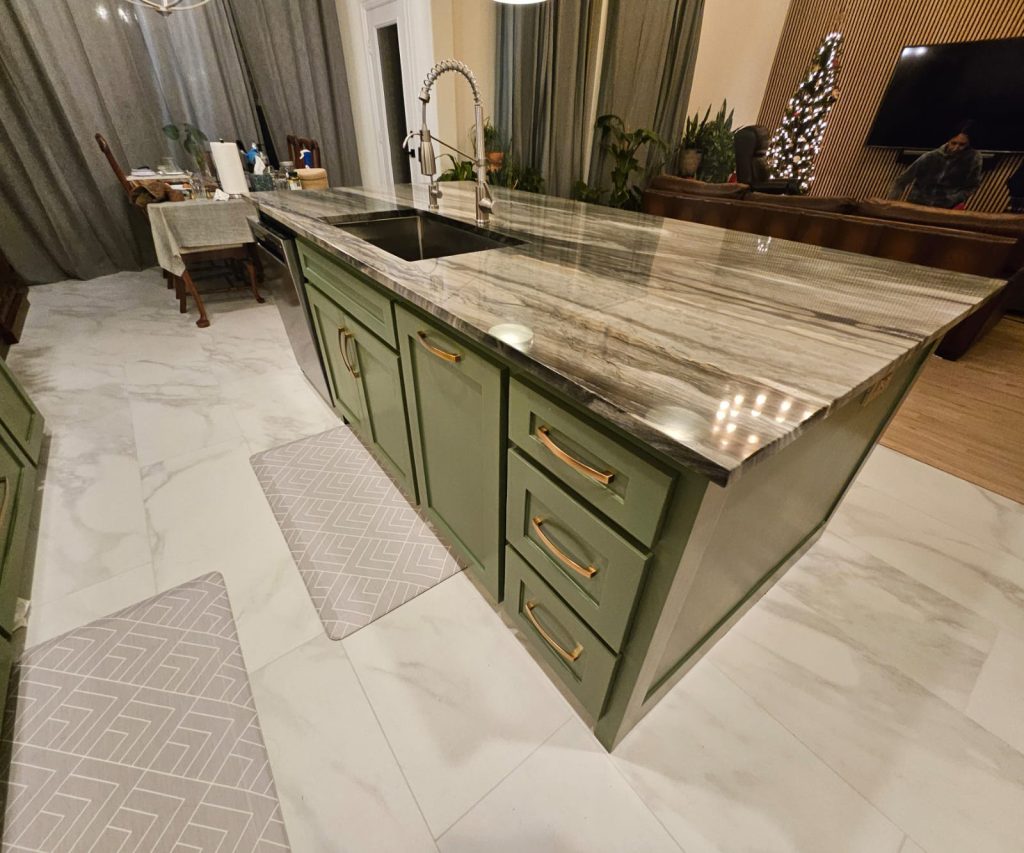 - Custom fabrication for countertops, waterfall islands, and backsplashes
